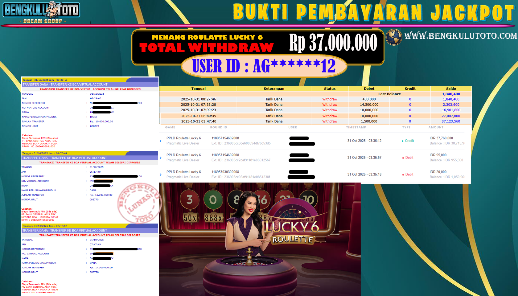 BUKTI JP – Selamat Kepada Member Kami BengkuluTOTO telah Jackpot di Tanggal 31 Oktober 2025 dengan Total Kemenangan Sebesar Rp. 37.000.000,-
